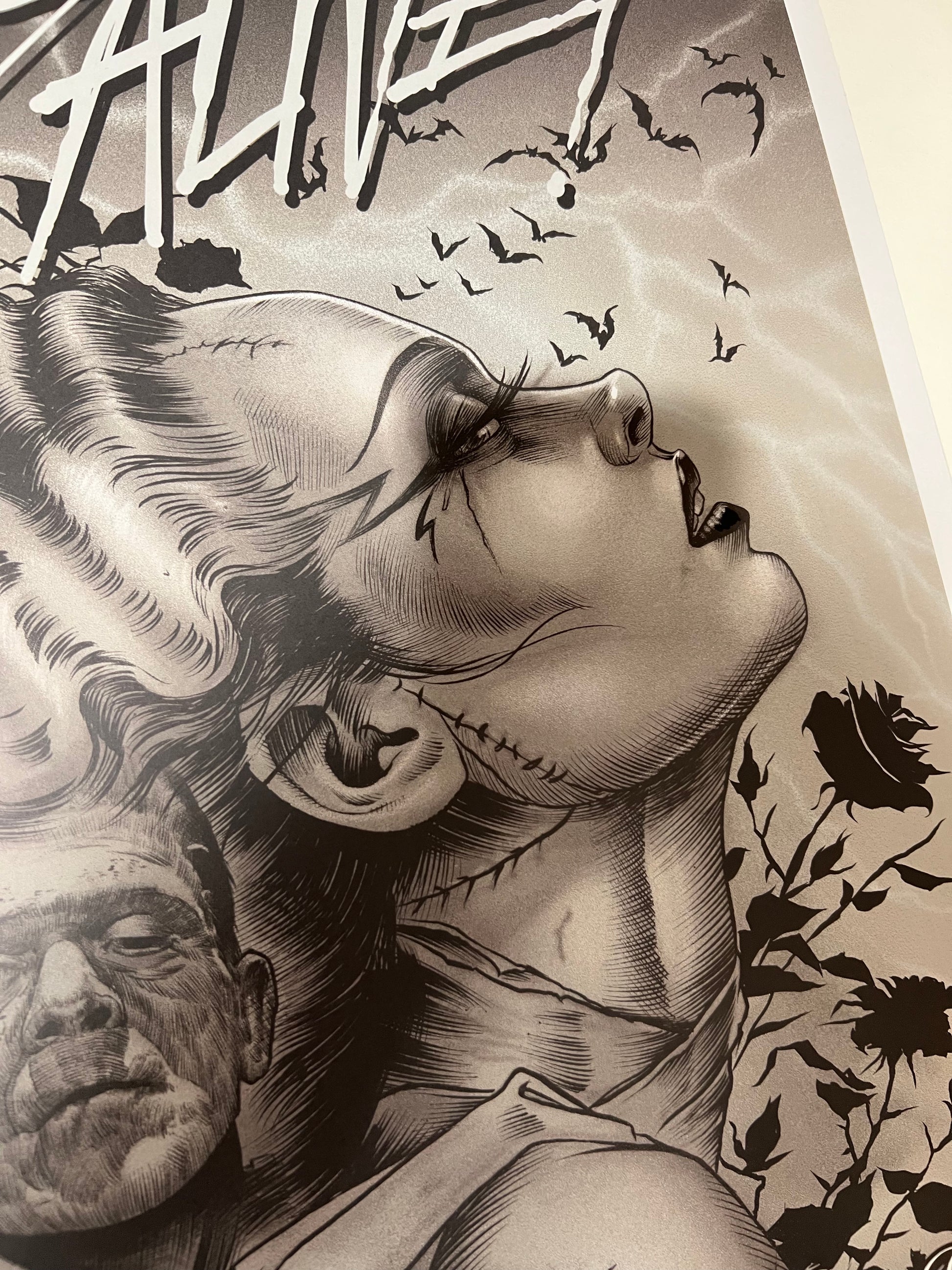 'SHE'S ALIVE' was an official Universal x Midsummer Scream 2025 print celebrating the 90-year anniversary of "Bride of Frankenstein." This exclusive print was only available at the Midsummer Scream event.